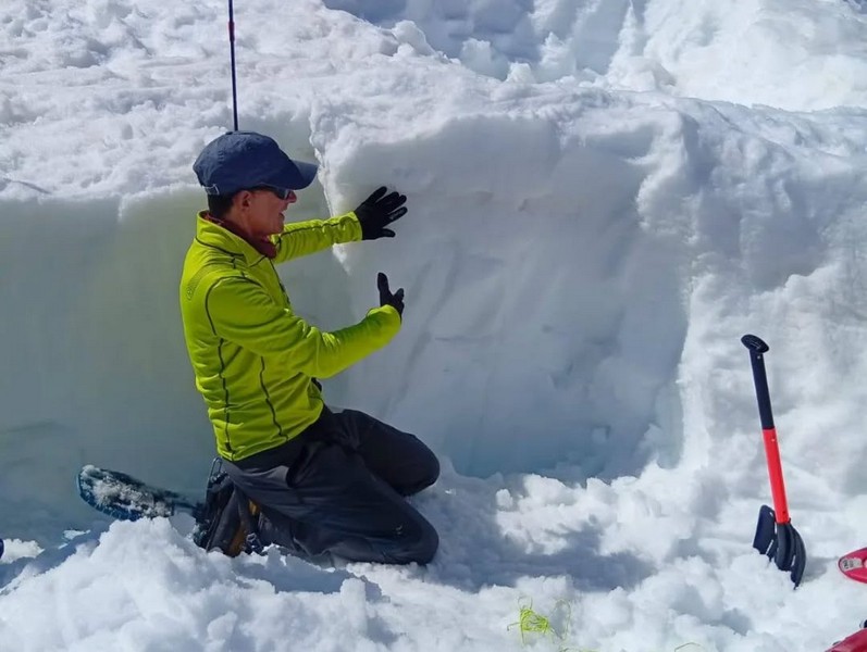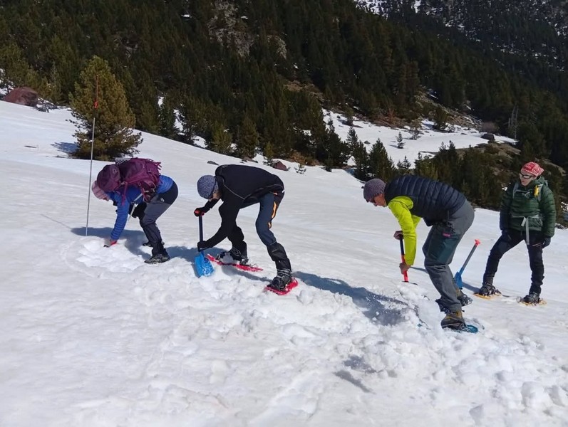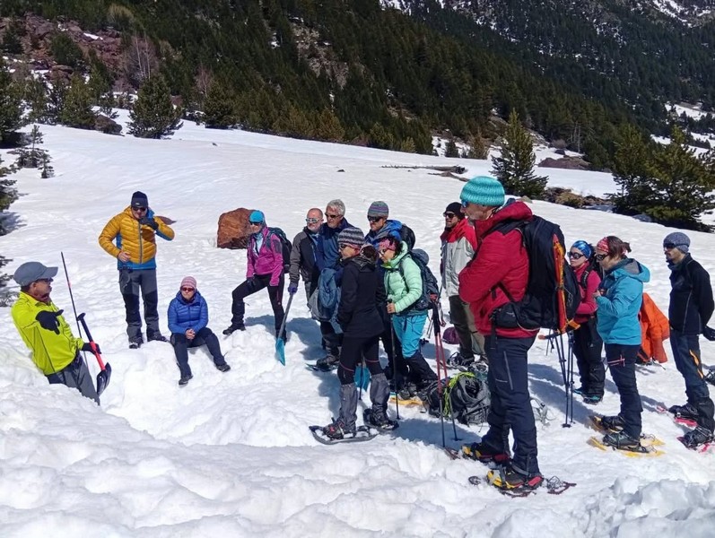 Como colofón a la salida, el sábado por la tarde, nuestro socio y amigo Craig, nos impartió una charla sobre gestión de aludes y el domingo, en los llanos del Hospital, dirigió unas prácticas de búsqueda de víctimas de aludes utilizando el DVA, sonda y pala, además de interesantes nociones sobre nivología.