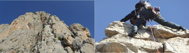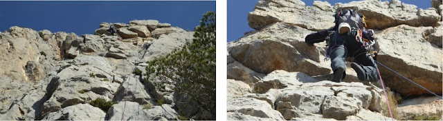 Cargados con las mochilas nos dirigimos a la base de la pared donde comienza a definirse el largo espolón. Una vez en su base buscamos el terreno en la roca más sencillo y seguro y comenzamos la escalada.