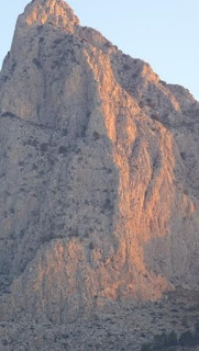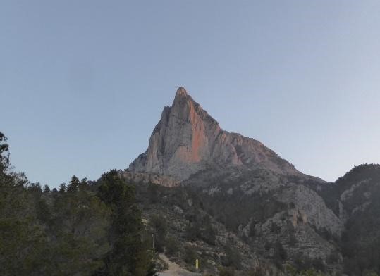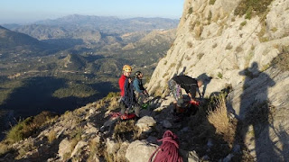 Salimos de Valencia a las 6 de la mañana tres miembros de la sección de montaña del CEV: Ángel Montero, Joan Toledo y Miguel Gascón. Media hora más tarde salen Vicente Cintado, Luís Martínez, y Toni Berlanga, componentes de la cordada de apoyo. Llegamos a Finestrat sobre las 8, preparamos las mochilas con algo de comida, agua, algún cortaviento, pies de gato, cuerdas y casco, nos equipamos, y por la senda lateral del helipuerto vamos subiendo en dirección al marcado espolón.