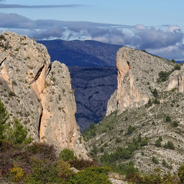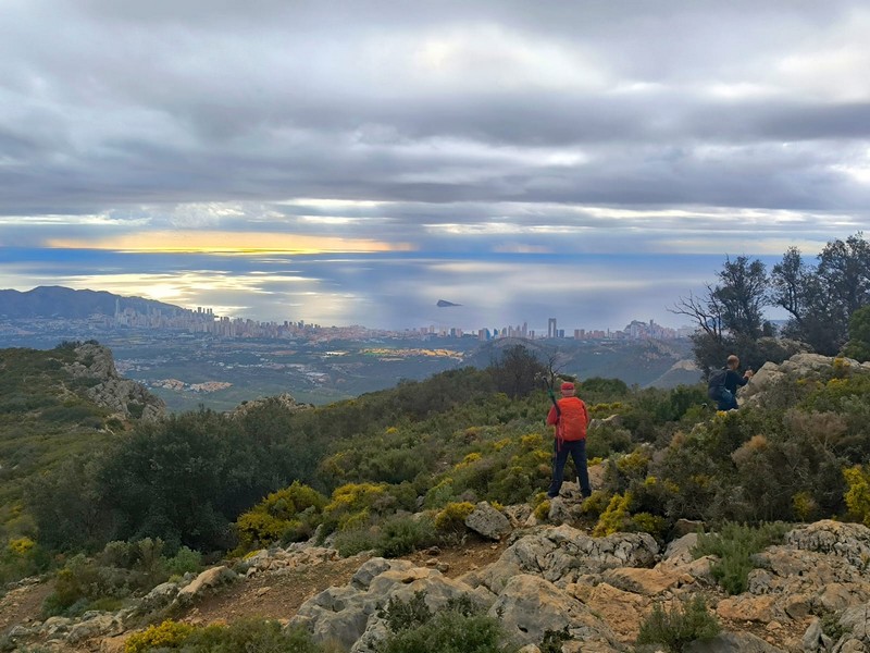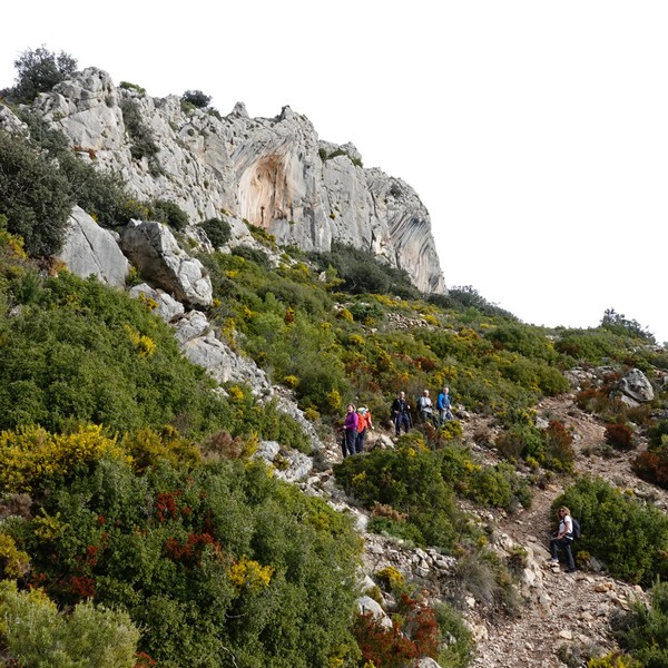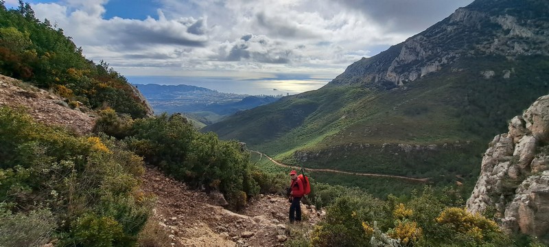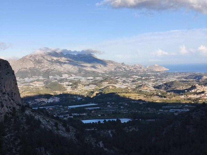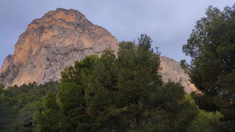 Dejamos los coches en el aparcamiento de la vía ferrata de Polop, junto al helipuerto, a 410 metros. Tras un breve almuerzo comenzamos la ruta tomando la senda que asciende por el Barranco de la Canal hasta llegar al Coll del Cigarrí, a 935 metros de altura. Durante la subida vamos teniendo a nuestra derecha las impresionantes paredes verticales del Ponoig.