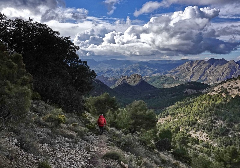 Descendemos al collado de nuevo para enlazar con el PR-CV 17. Antes de seguir bajando tomamos fuerzas en una tranquila comida al pie de la montaña. Seguimos bajando por la senda, que posteriormente se convierte en camino, hasta llegar a la Casa de Dios. Tras un pequeño descanso retomamos la marcha hasta llegar al mirador del Castellet, donde el camino se convierte en una pista asfaltada. Después de una serpenteante bajada tomamos la senda de la variante PR-CV 017, que atravesando un frondoso bosque nos llevará finalmente hasta los coches.